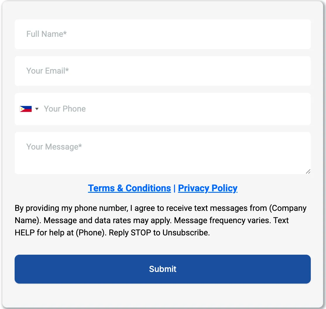 Any forms on my website that collect phone numbers include a consent checkbox.